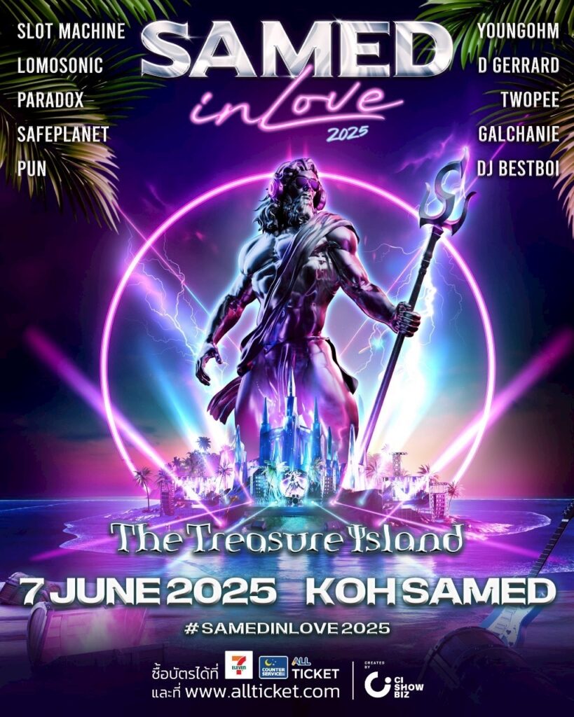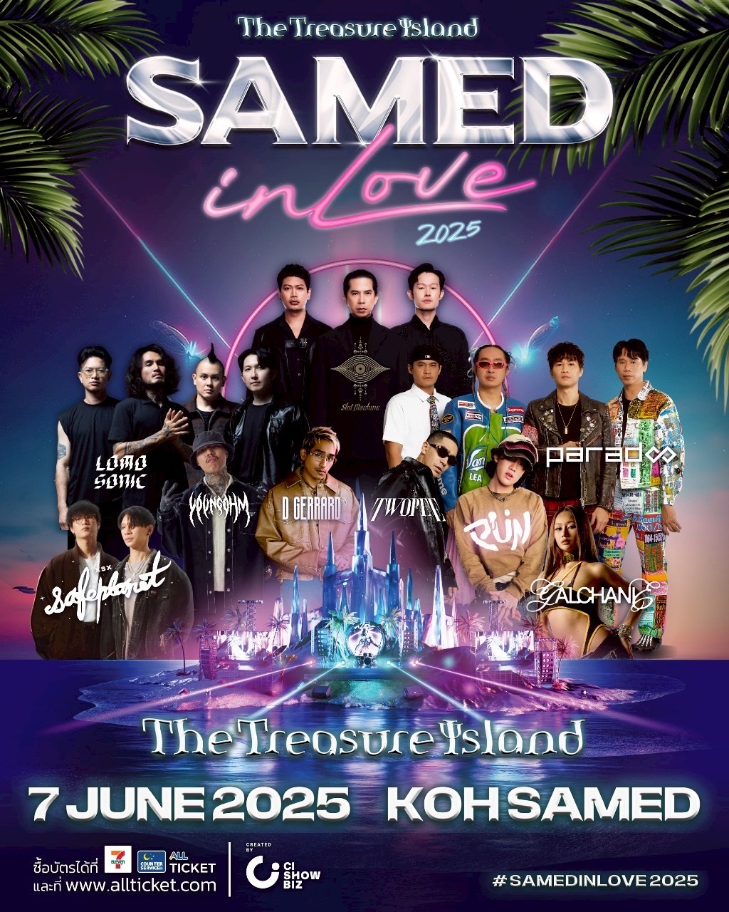ความสนุกสุดมันส์กำลังจะกลับมาอีกครั้ง เมื่อ CI Showbiz ผู้จัดคอนเสิร์ตชั้นนำ พร้อมพาคุณออกเดินทางสู่ดินแดนแห่งเสียงดนตรีใน SAMED IN LOVE 2025 ภายใต้ธีม “THE TREASURE ISLAND” ที่จะพาคุณล่าขุมทรัพย์แห่งความฟินแบบไร้ขีดจำกัด ! ในวันเสาร์ที่ 7 มิถุนายน 2568 ณ เกาะเสม็ด จังหวัดระยอง