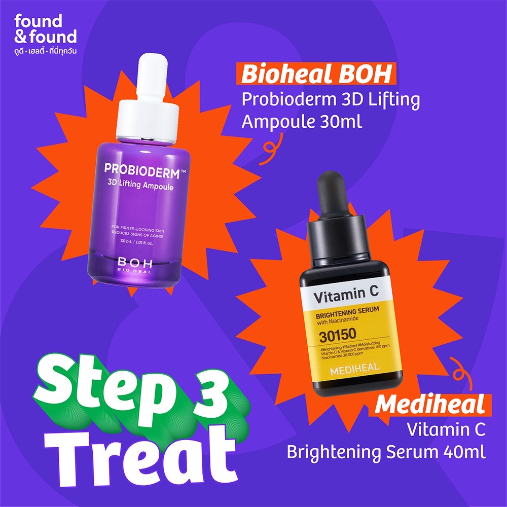 3. Treat – ดูแลปัญหาผิวแบบตรงจุด เลือกเซรั่มหรือแอมพูลที่ตอบโจทย์ปัญหาผิวเฉพาะบุคคล เช่น ผิวอ่อนแอ รอยแดง สิว หรือผิวขาดน้ำ เน้นการดูแลแบบเฉพาะจุด ไม่บำรุงเกินความจำเป็น